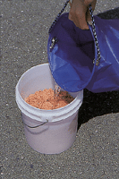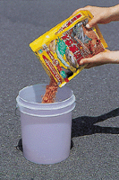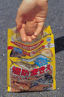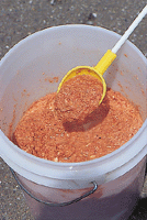 1. 「堤防まきえ」を用意し、ハサミで袋を切る。 | 2. 「堤防まきえ」の袋から直接適量取り出し、両手を使って小さなボール(ピンポン玉位)に丸め、直接ポイントに投入する。 | 3. ヒシャクを使う場合は、「堤防まきえ」をバケツに移す。 | 4. ヒシャクで撒きやすくするため、適量の海水を加える。 | 5. ヒシャクのカップにマキエを入れた状態。 |